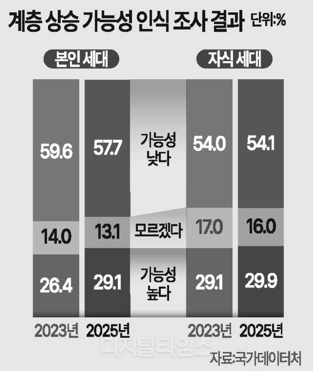 국가데이터처가 11일 발표한 ‘2025년 사회조사 결과’에 따르면 19세 이상 국민 중 앞으로 사회·경제적 지위 상승 가능성이 낮다고 본 비율은 57.7%였다. 2년 전보다 1.9%포인트 줄었지만 여전히 절반 이상이 계층 사다리에 대한 확신이 없었다.