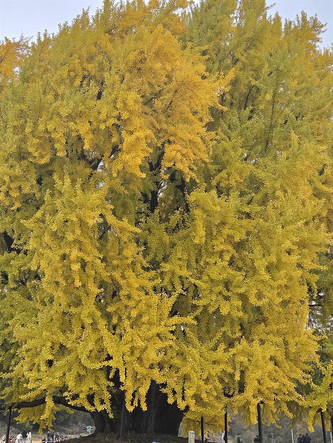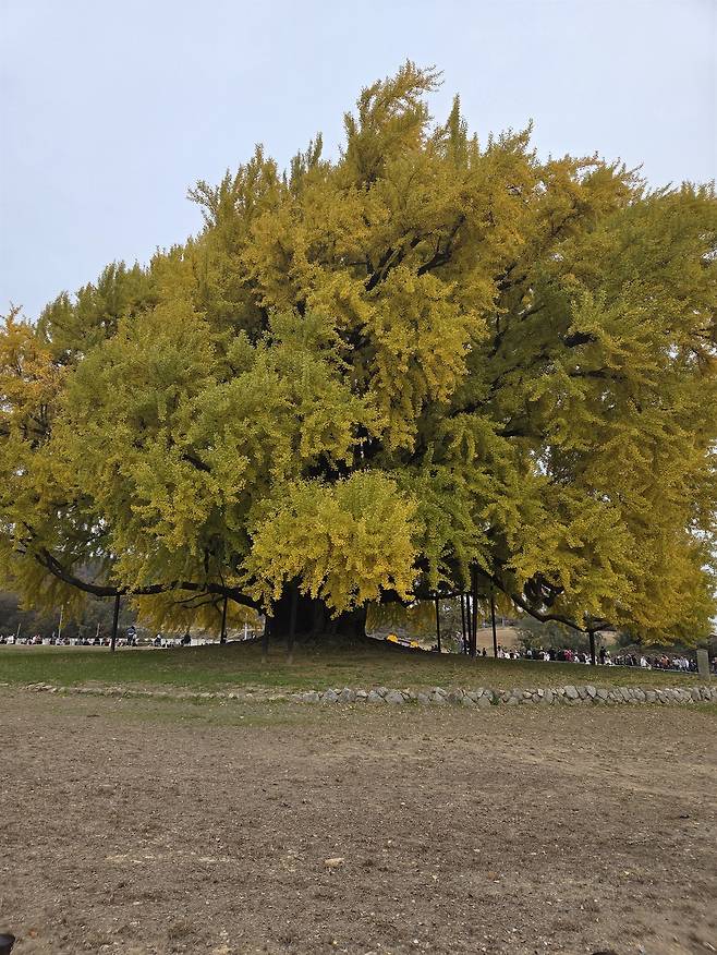 멀리서 보이는 은행나무는 기대보다 크지도 멋있지도 않았다. 하지만 점차 가까이 다가가니 나이를 가늠할 수 없는 웅장한 은행나무가 신비로운 기운을 뿜으며 사람들을 360도로 포옹하고 있었다. 나무를 보호하기 위해 울타리가 쳐져 있고, 은행나무 둘레 가득 저마다 인증샷을 찍느라 빈틈 찾기도 힘든 정도였다.
