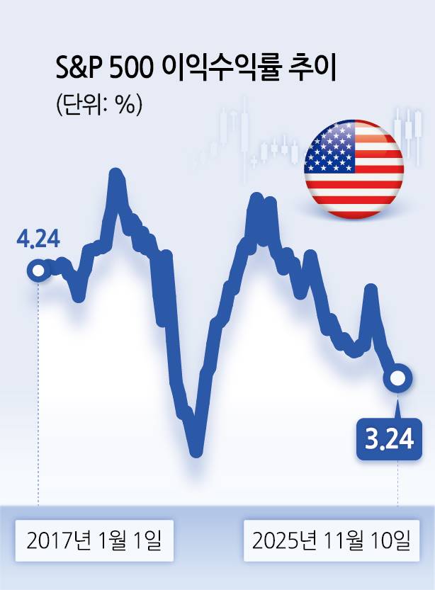 11일 금융투자업계에 따르면 전날 기준 스탠더드앤드푸어스(S&P)500지수의 이익수익률이 3.24%로집계됐다.