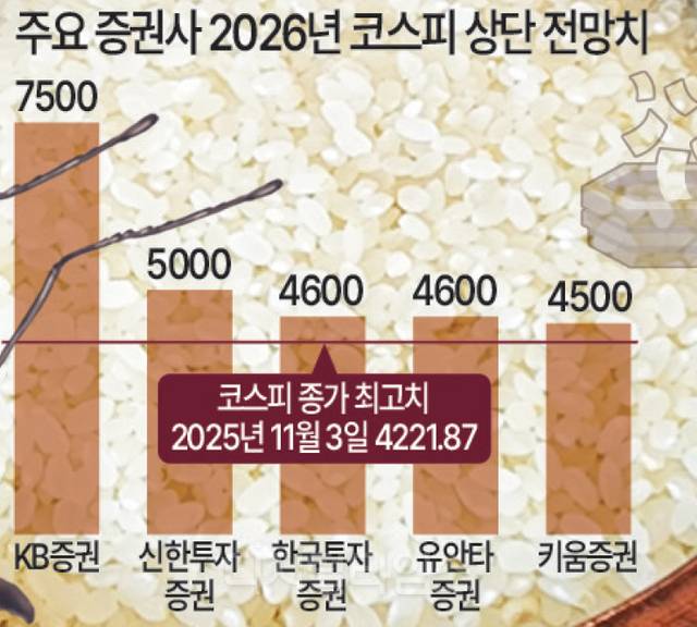 KB증권은 내년 코스피 타깃을 5000, 최고치를 7500으로 제시했다. 김동원 KB증권 연구원은 “올해 상승장은 3저(저금리·저물가·저환율) 호황에 따른 밸류에이션 확장과 실적 사이클 진입으로 40년 만의 강세장 진입으로 판단한다”며 “장기 강세장 시나리오에서는 실적 변화에 따라 코스피가 7500까지 상승할 수 있다”고 전망했다. 이의 근거로 △2026년 코스피 영업이익 401조원(전년 대비 36% 증가) △현재 코스피 PBR 1.4배로 여전히 글로벌 증시 대비 저평가 등을 밝혔다.