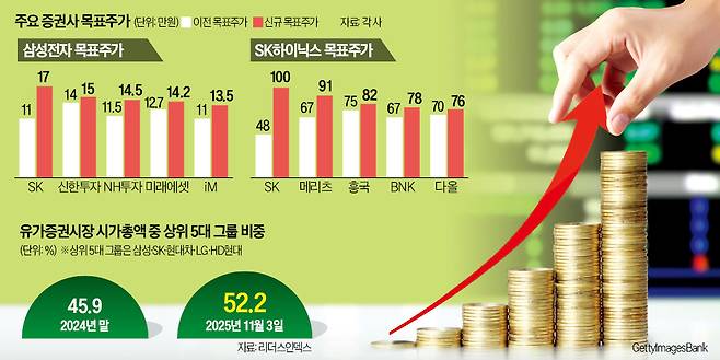 대형주 쏠림 현상에 따라 유가증권시장 시가총액 중 상위 5개 그룹주(삼성·SK·현대자동차·LG·HD현대) 비중이 절반을 넘긴 것으로 집계됐다. 리더스인덱스에 따르면 이 비중은 코스피지수가 사상 최고치를 기록한 이달 3일 기준 52.2%로 작년 말 45.9%에서 6.3%포인트 높아졌다.