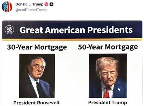 트럼프 대통령이 50년 모기지 정책을 추진하면 루스벨트와 함께 미국에서 손꼽히는 위대한 대통령이 될 것이라는 메시지로 읽힙니다.