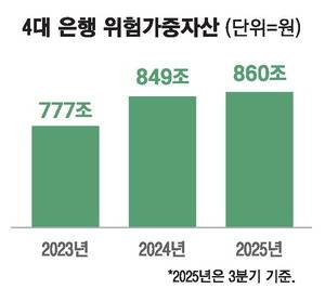 올해 3분기 기준 4대 시중은행의 합산 위험가중자산은 860조원으로 2021년(716조원) 대비 20% 증가했다. 금융권에 따르면 보통 달러당 원화값이 10원 내리면 4대 금융그룹의 위험가중자산은 약 5000억원 늘어나고, 보통주자본비율은 2~3bp(1bp=0.01%포인트) 하락하게 된다.