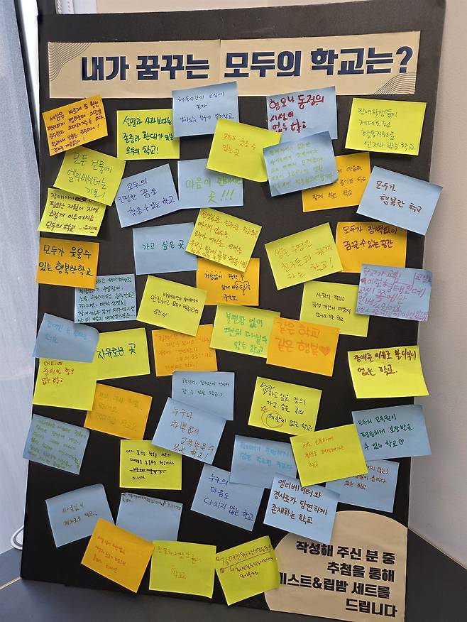 이날 참가자들이 포스트잇에 써서 붙인 '내가 원하는 모두의 학교'에는 이런 문구들이 쓰여 있었다. "엘리베이터와 경사로가 당연하게 존재하는 학교" "장애를 이유로 불이익이 없는 학교" "하고 싶은 것과 가고 싶은 곳의 제한이 없는 학교" "설명과 사과보다 존중과 환대가 있는 모두의 학교" "혐오나 동정의 시선이 없는 학교" "사회의 책임을 학생 개인이 떠맡지 않아도 되는 학교"
