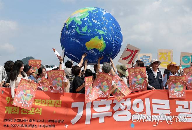 | ▲ 8월 28일 927기후정의행진 조직위원회 주최로 서울 종로구 광화문광장에서 열린 '927기후정의행진 선포 기자회견'에서 참석자들이 927기후정의행진 의미와 계획를 발표하고 있다. |
