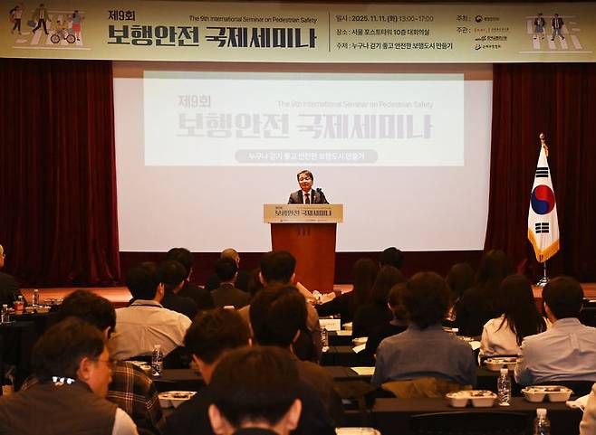 [서울=뉴시스] 김광용 행정안전부 재난안전관리본부장이 11일 서울 포스트타워에서 ‘누구나 걷기 좋고 안전한 보행도시 만들기’를 주제로 열린 ‘제9회 보행안전 국제세미나’에 참석해 개회사를 하고 있다. (사진= 행정안전부 제공) 2025.11.11. photo@newsis.com *재판매 및 DB 금지