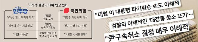 법원 상급심 판단이 필요하다는 주장도 사안에 따라 갈렸다. 민주당은 대장동 항소 포기 사건에서는 불필요하다고 주장했지만 윤 전 대통령 구속취소 건에서는 필요하다고 했다. 국민의힘은 구속취소 사건과 달리 대장동 항소 포기 건에서 상급심 판단을 강조하고 있다.