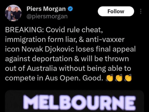 이후에도 모건은 사회관계망서비스(SNS)를 통해 "충격: 코로나 규정 사기꾼이자 입국 서류 거짓 작성자, 반(反)백신의 상징 노박 조코비치가 추방 항소에서 최종 패소했다. 이제 그는 호주 오픈에 출전하지 못한 채 호주에서 쫓겨난다. 잘 됐다"라고 조롱했다.
