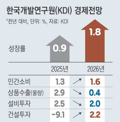 한국개발연구원(KDI)이 내년 한국 경제성장률 전망치를 1.6%에서 1.8%로 올렸다. 도널드 트럼프 미국 행정부의 관세 인상으로 수출이 올해보다 어렵지만, 소비가 살아나면서 성장세가 예상보다 강화될 것으로 내다봤다. 금융연구원은 2%대 성장을 내다봤다. 주요 기관들이 내수회복을 점치며 내년도 성장률을 상향조정하고 있다.