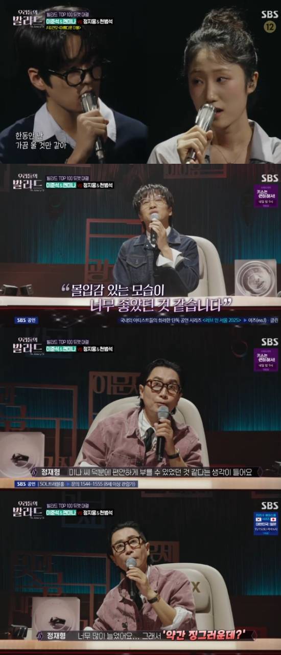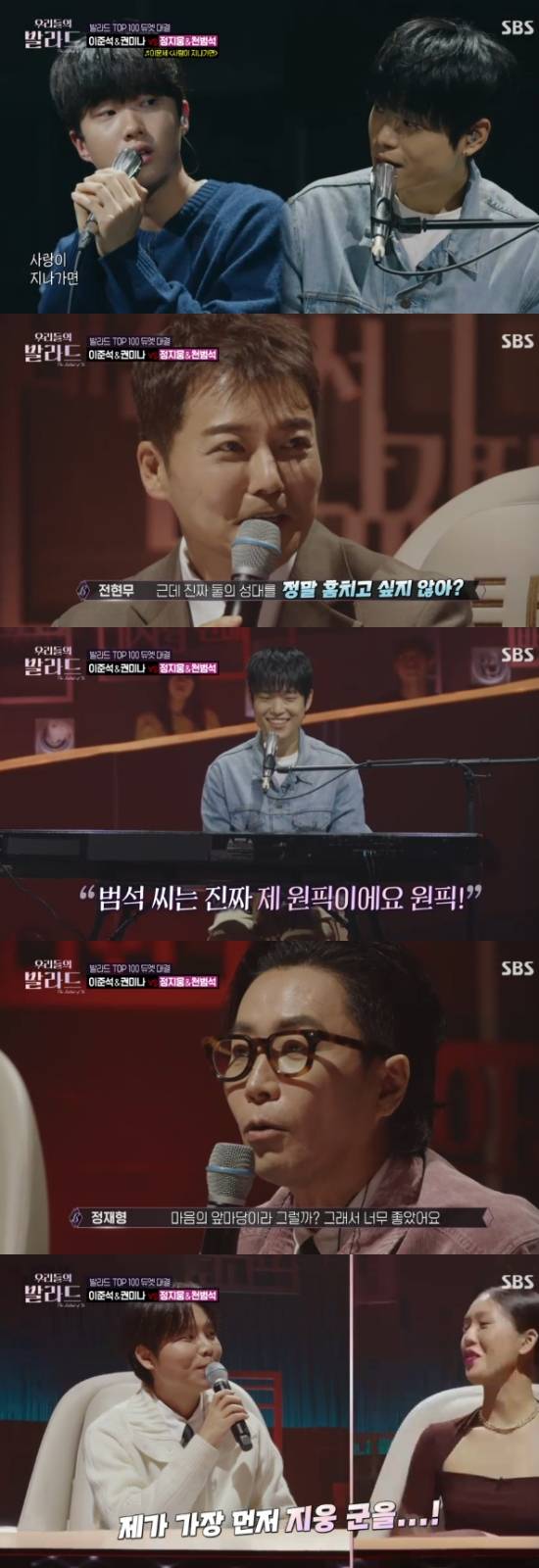 11일 방송된 SBS 예능 프로그램 '우리들의 발라드'에서는 3라운드 듀엣 경연이 펼쳐졌고, 천범석과 정지웅이 함께 무대를 꾸몄다.