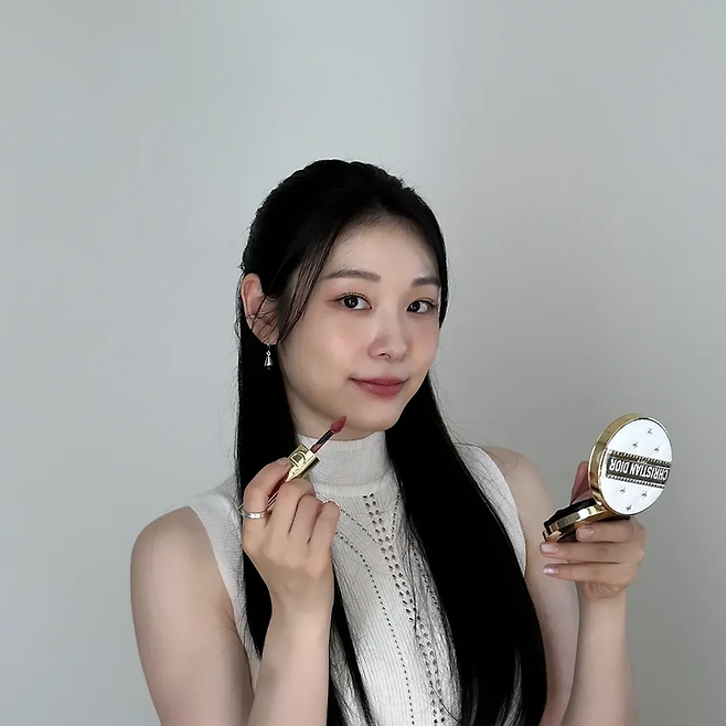 크리스찬 디올 쿠션과 립을 손에 들고 미소를 짓는 모습으로 고급스러운 우아함을 드러냈다. 매끄러운 피부결과 또렷한 눈매, 은은한 장밋빛 립 컬러가 조화를 이루며 한층 여유롭고 성숙한 매력을 풍긴다.
