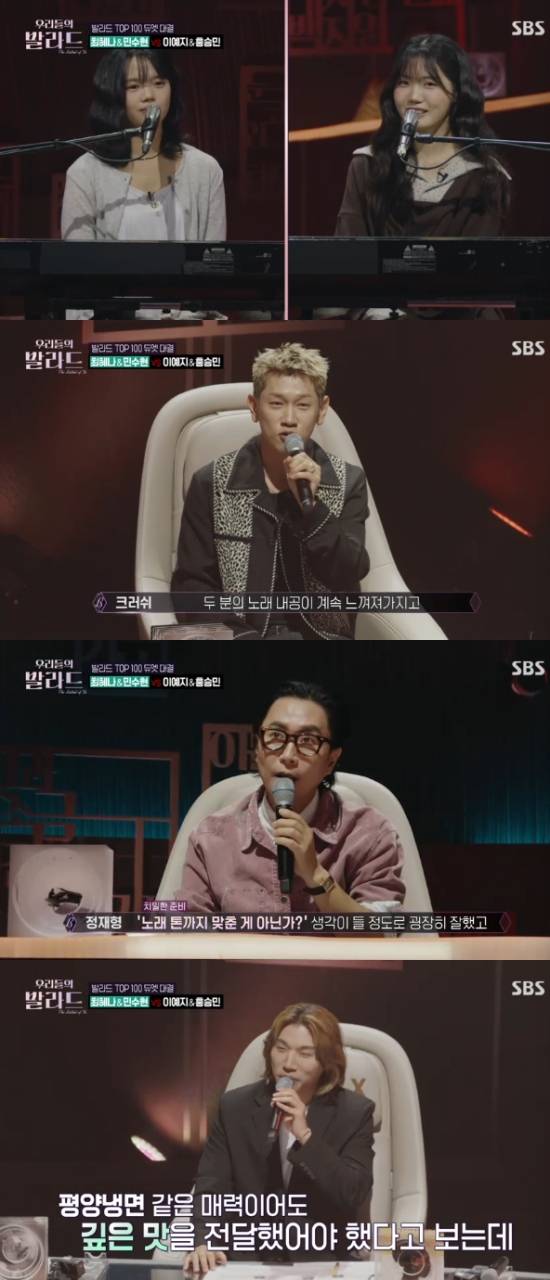 11일 방송된 SBS 예능 프로그램 '우리들의 발라드'에서는 3라운드 듀엣 경연이 펼쳐졌고, 이예지X홍승민이 최혜나X민수현과 대결했다.
