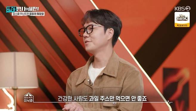 잡스가 주스만 고집했다는 말에 이낙준은 "원래 건강한 사람도 과일 주스만 먹으면 안 좋다. 체력과 면역력을 위해 단백질 섭취가 중요한데 과일에는 단백질이 없고 당분이 많다. 혈당은 치솟는데 낮춰줄 인슐린은 안 나오니까 당뇨라는 만성질환으로 이어진다. 고혈당을 좋아하는 건 암세포다. 수술로 약해진 췌장인데 당을 주니 악순환이 되는 거다"라고 설명했다.