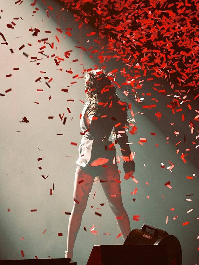 공개된 사진 속 효린은 ‘퍼포먼스 퀸’답게 다양한 콘셉트의 무대 의상으로 독보적인 존재감을 드러냈다. 흰색 와이셔츠에 블랙 타이, 시스루 블랙 스타킹과 숏 팬츠를 매치한 의상은 섹시하면서도 시크한 분위기를 풍겼다. 특히 블랙 재킷과 흰색 장갑을 매치한 무대에서는 마치 마술사 같은 콘셉트로 강렬한 퍼포먼스를 예고했다. 또한, 밝은 노란색의 레이스 미니 드레스를 입고 폭발적인 가창력을 선보이는 모습은 관객들의 환호를 자아냈다.