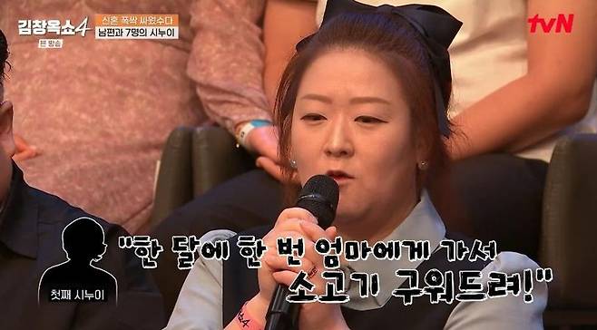 이날 남편 때문에 속앓이 중인 신혼 10개월 차 아내의 사연이 공개됐다. 아내는 "저에게는 시누이가 7명이가 있다. 제 남편은 7녀 1남 중 막내다"라고 밝혀 관객석을 술렁이게 했다.