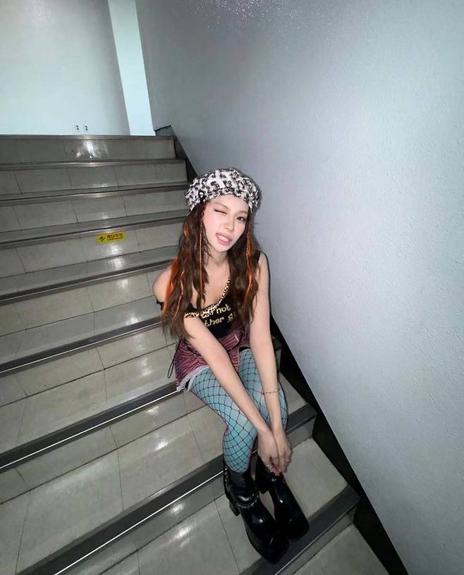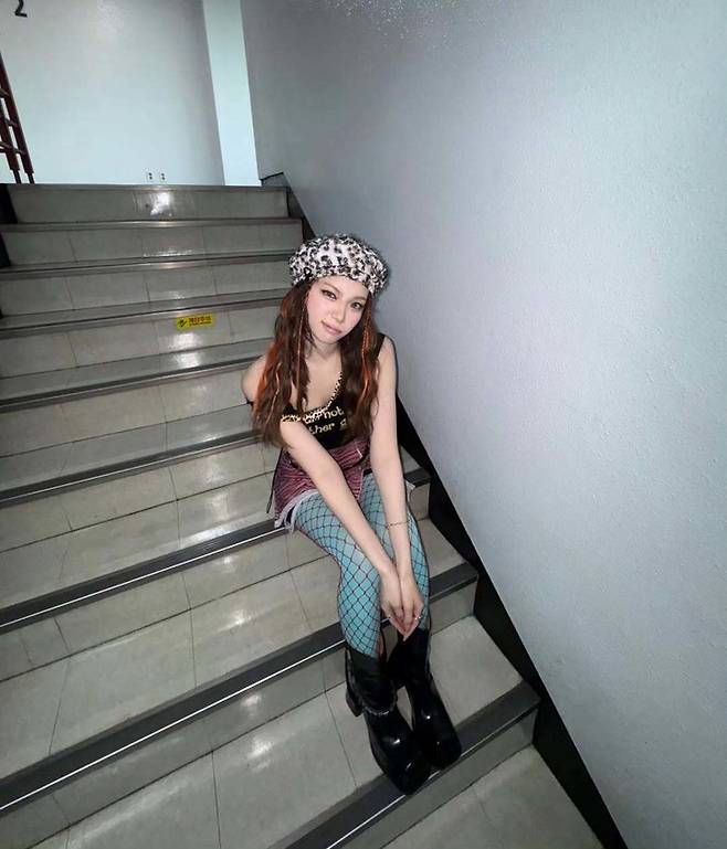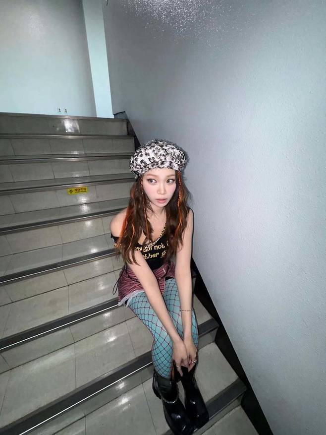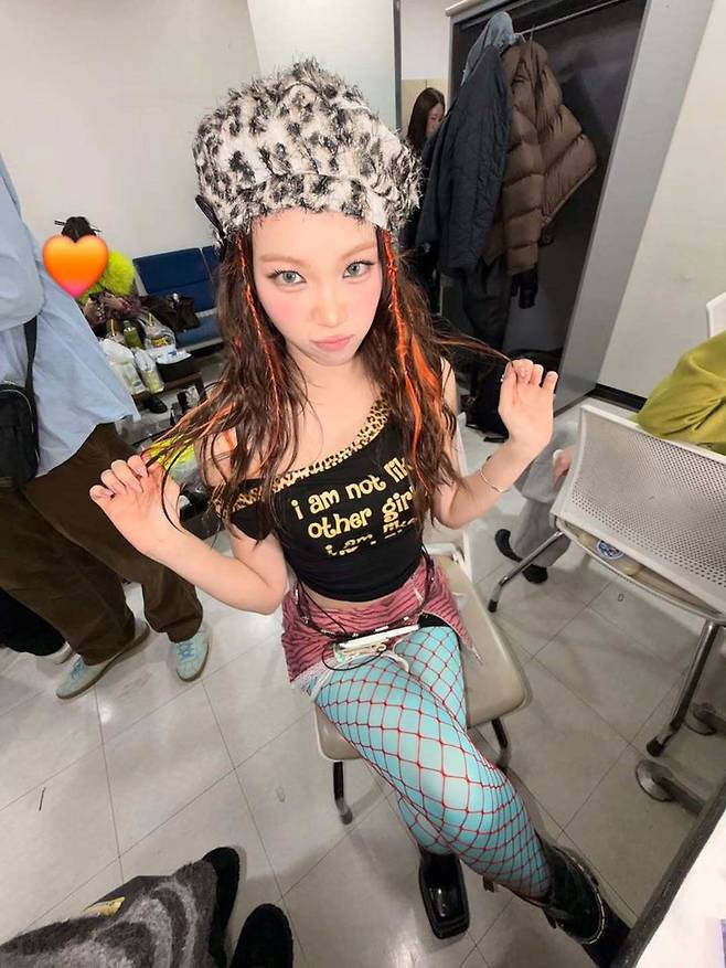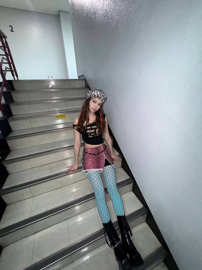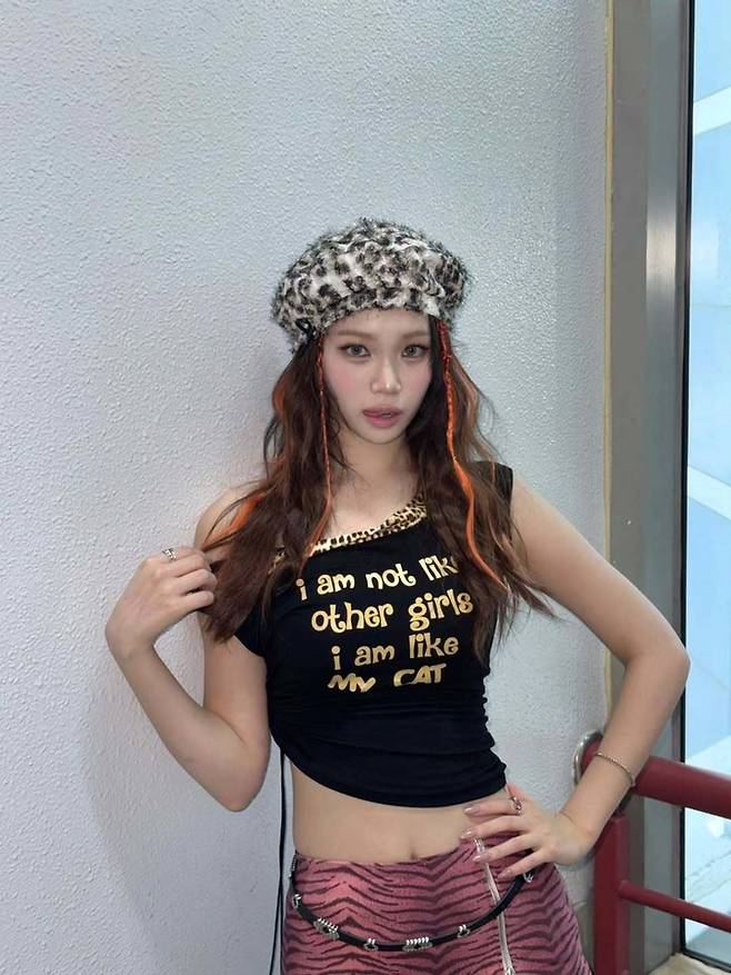 'I am not like other girls' 문구가 새겨진 블랙 슬리브리스 톱에 핑크 지브라 미니스커트, 그리고 청록색 그물 스타킹을 매치해 파격적인 Y2K 무드를 완성했다.