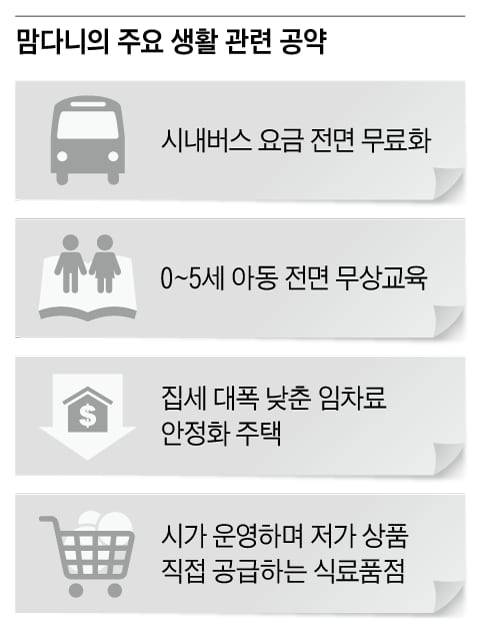 맘다니는 이 밖에 생후 다섯 살까지 모든 아이에 대한 무상교육, 시내버스 무료화, 시중보다 대폭 임차료를 낮춘 임차료 안정화 주택 등 대중 영합적 공약을 대거 내놨다. 하지만 이 같은 약속이 실행될지는 미지수다. 맘다니의 선거운동을 지원했던 민주당 소속 캐시 호컬 주지사부터 ‘100% 공약 이행’에 제동을 걸고 있기 때문이다. 호컬은 지난 9일 “버스 및 지하철 요금에 의존하는 시스템에서 재정을 빼내는 계획을 지금 당장 시작할 수는 없다”며 뉴욕 시내버스 무료화 정책에 대한 반대 입장을 분명히 했다. 앞서 호컬은 지난 8월에도 한 조찬 행사에서 맘다니의 시영 식료품점 구상에 대해 “나는 자유 기업 체제를 선호한다”며 단호하게 반대 의사를 밝힌 바 있다.