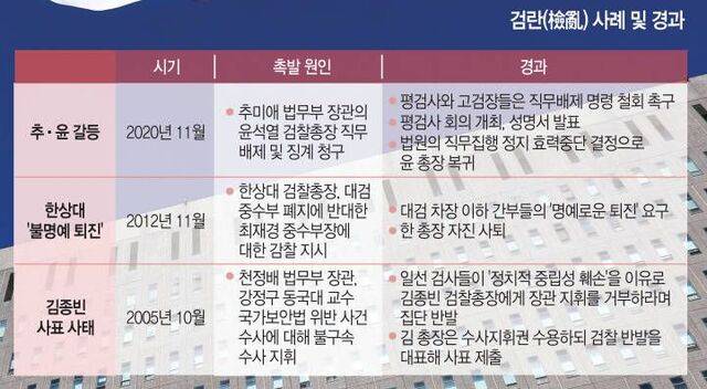 이번 사태의 또 다른 특징은 반발의 구심점 역할을 하는 검찰 인사가 보이지 않는다는 점이다. 2012년 한 총장 당시 검란은 사태 당사자인 최재경 대검 중수부장을 필두로 채동욱 대검 차장과 윤석열 서울중앙지검 특수1부장 등이 중심 역할을 했다. 2020년 추미애 법무부 장관이 윤석열 당시 검찰총장을 직무에서 배제하고 징계를 청구하자 검사들이 반발했을 때도 특수부 소속 검사들이 구심점 역할을 했었다. 검사장급 한 인사는 “이번엔 검찰청이 폐지되는 상황이어서 과거와 양상이 다를 수밖에 없다”고 말했다.