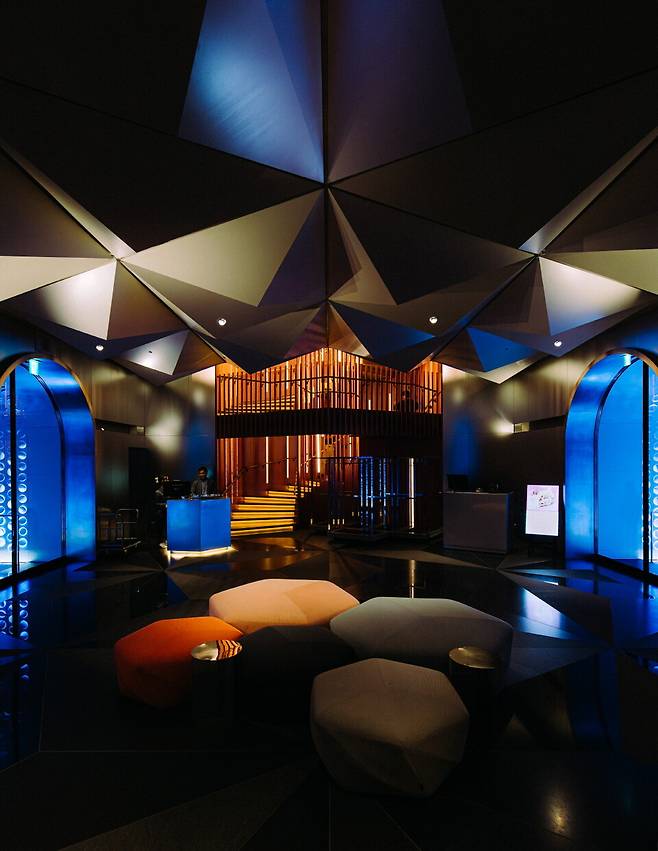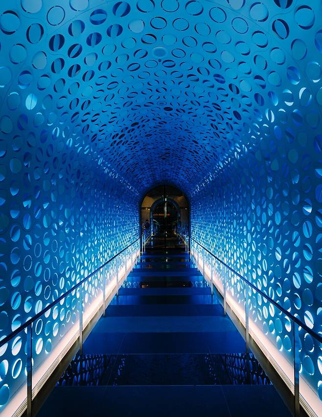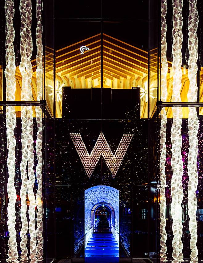 안도 다다오가 꽁꽁 싸맨 W의 검정 하오리를 걷어 내면, 비로소 W호텔다운 터널이 펼쳐진다. 터널에는 총 3,000개가 넘는 원형 금속 아치가 조각되어 있는데, 이는 일본의 종이접기 예술, '오리가미(折紙)'에서 영감을 받아 디자인한 것이다. 터널은 봄의 벚꽃을 상징하는 핑크색, 여름의 바다를 상징하는 푸른색, 가을의 단풍을 상징하는 노란색, 겨울의 눈을 상징하는 하얀색 순서로 계절마다 색을 달리한다. 긴 터널에서 빠져나와 로비로 향하는 엘리베이터를 기다리고 있자면, 문득 매트한 질감의 천장 구조물이 눈에 띈다. 이는 삼나무 잎을 묘사한 '아사노하(麻の葉)' 문양을 형상화한 구조물이다. 일본 사람들은 생명력이 강한 삼나무의 잎에는 나쁜 기운을 내쫓는 힘이 있다고 믿는다.
