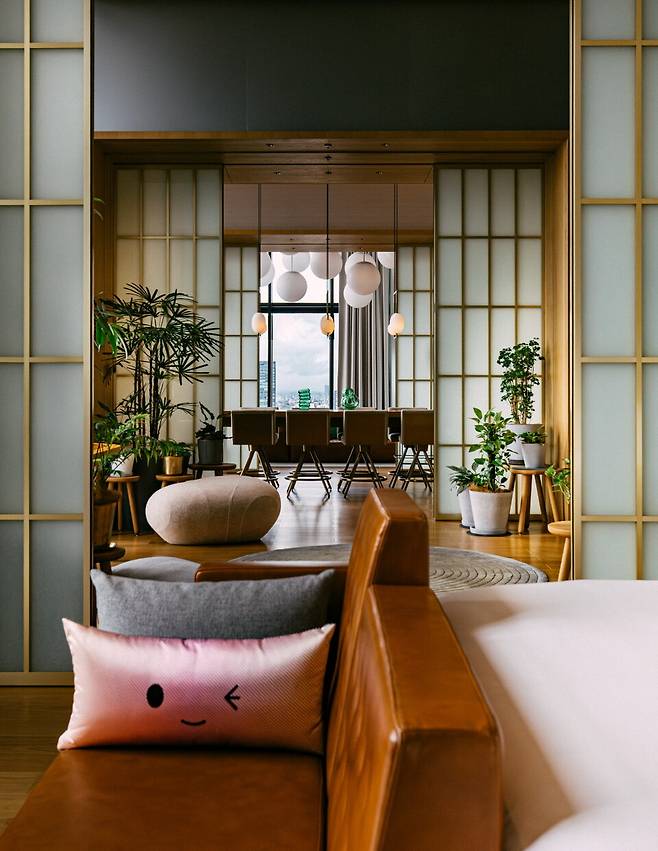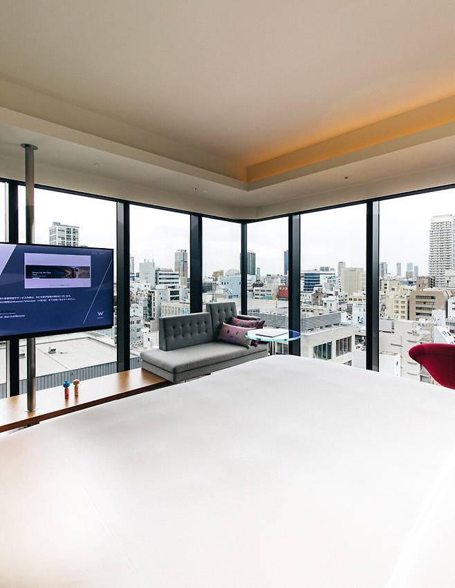 그렇다고 우리의 내향인들, 걱정할 건 없다. 호텔은 방에서 자는 곳이다. W 오사카의 룸 타입은 총 6개. 그중 가장 추천하는 타입은 코너룸인 스펙타큘러(Spectacular) 타입이다. 침대를 중심으로 양쪽 통창이 뚫려 있어 누웠을 때 개방감이 좋다. 27층에 위치한 '익스트림 와우(Extreme Wow) 타입'은 프레지덴셜 스위트다. 일본 전통 가옥의 방식에 따라 정원, 침실, 욕실, 거실, 주방으로 공간을 5등분 했다. 침대 위쪽으로는 네덜란드 출신 아티스트, '지그리드 칼론(Sigrid Calon)'의 작품이 전시되어 있다. 침대 왼편, 욕실 한가운데에는 팽이 모양의 스테인리스 욕조가 놓여 있는데, 참으로 도발적이다. 욕조에 들어가면 어느 방향으로 둘러봐도 씻고 있는 자신이 비춰 보인다.