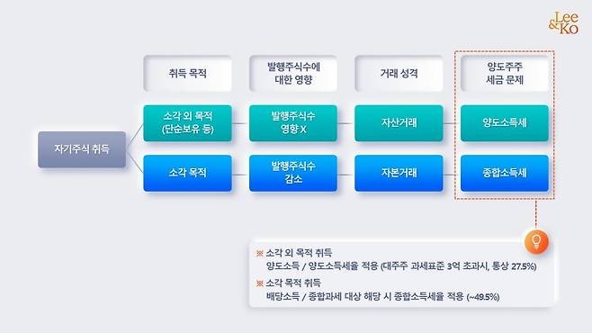 자기주식 소각 의무화 규정이 도입되면 소각을 전제로 한 자기주식 취득대가는 배당소득으로 분류될 가능성이 크다. 이때 정부가 병행하여 추진 중인 배당소득 분리과세 제도가 도입되어 시행된다면(최고세율 25%로 논의 중), 현행과 같이 배당소득으로 분류되어 종합소득세 누진세율이 적용되는 경우에 비해서는 세부담이 줄어들 수 있다.