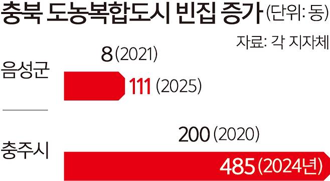11일 음성군에 따르면 2021년 58동이던 빈집은 지난 9월 111동으로 두 배 가까이 늘었다. 이 기간 음성읍은 10동에서 45동으로, 금왕읍은 13동에서 30동으로 급증했지만 맹동면은 14동에서 10동으로 증가 폭이 크지 않다. 같은 기간 인구는 음성읍 1만6669명에서 1만5829명으로 5.0%(840명), 금왕읍 1만9556명에서 1만8613명으로 4.8%(943명) 감소했다. 맹동면(1만3094명에서 1만3064명)은 인구 변화가 거의 없다. 맹동면은 충북혁신도시와 옛 면소재지가 혼재해 있다.