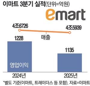 이마트는 11일 별도 기준(이마트·트레이더스 등 포함) 3분기 매출이 4조5939억원, 영업이익은 1135억원이라고 밝혔다. 지난해 같은 기간에 비해 각각 1.7%, 7.6% 하락한 수치다.
