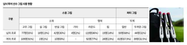 국내 투어 프로들은 어떤 그립을 선호하는지 직접 조사했다. 드라이버나 아이언에 쓰는 스윙 그립의 경우 소재로 분류했을 때 남녀 모두 고무 그립 사용률이 높았다. 특히 여자 프로들의 경우 고무 그립 사용률이 무려 91%에 달했다. 형태에 따른 분류로 보면 립 그립보다는 라운드 그립 비중이 월등히 높았다. 퍼팅 그립의 경우 일반 그립과 두꺼운 그립의 비율은 남녀 모두 약 7대3 정도로 나타났다.