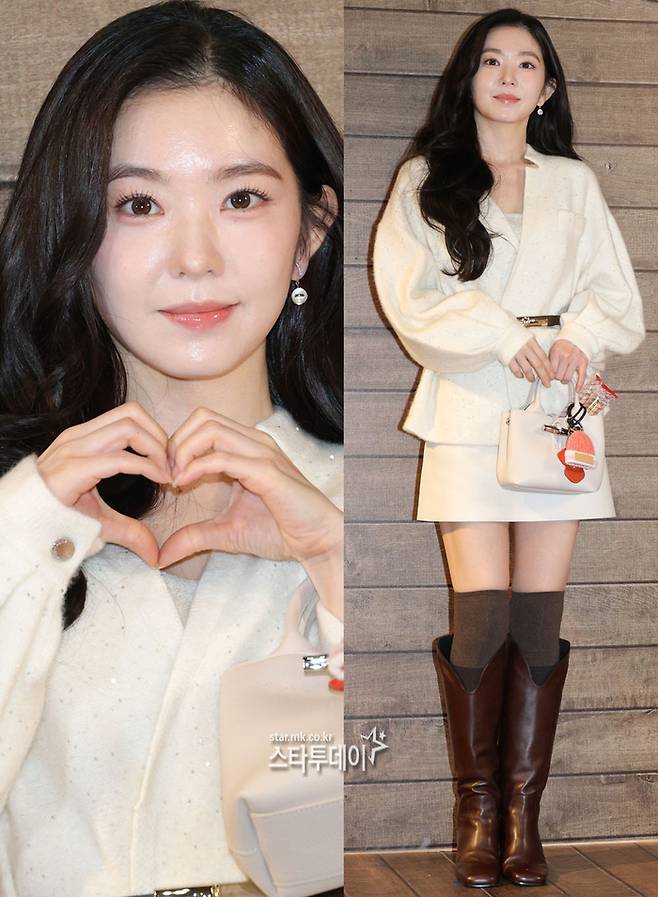 아이린은 아이보리 컬러의 재킷과 미니스커트에 롱부츠를 매치해 단아한 가을 분위기를 연출했다.