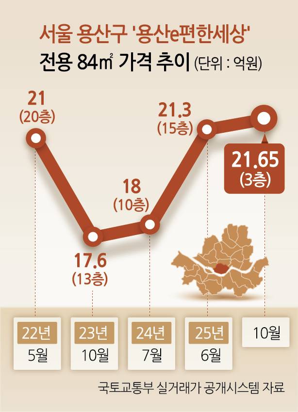 또 다른 인근 주상복합 단지 ‘용산CJ나인파크’ 역시 비슷한 흐름이다. 84㎡형이 2022년 5월 15억6000만원(26층)까지 급등했다가 13억원선까지 하락했지만, 최근 청와대 복귀 일정이 가시화되며 지난달 31일 다시 15억6000만원(27층)을 기록하며 신고가를 회복했다.