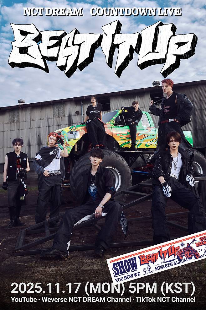 12일 SM엔터테인먼트에 따르면 엔시티 드림은 미니 6집 '비트 잇 업(Beat It Up)' 발매 당일인 17일 오후 5시부터 유튜브 공식 채널, 틱톡 채널 등을 통해 카운트다운 라이브 방송을 진행하고 전 세계 팬들과 새 앨범 발매를 축하하는 시간을 갖는다.