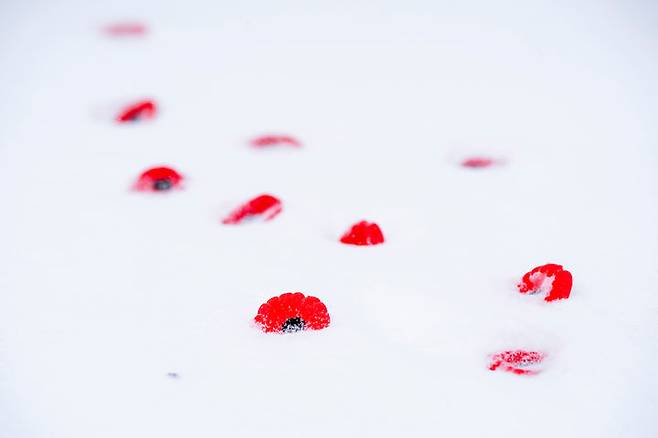 [몬트리올=AP/뉴시스] 11일(현지 시간) 캐나다 몬트리올에서 열린 종전 기념일 추모 행사에서 붉은 양귀비 조화들이 하얀 눈 위에 뿌려져 있다. 2025.11.12.