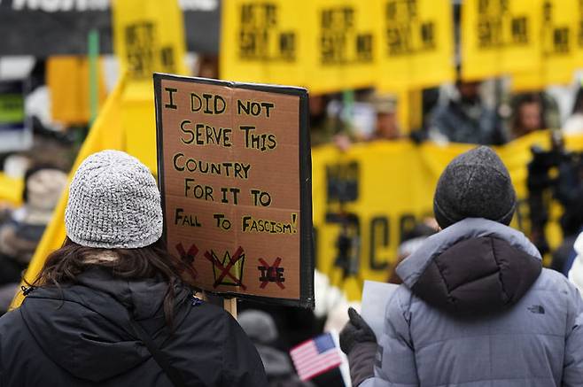 [시카고=AP/뉴시스] 11일(현지 시간) 미 일리노이주 시카고에서 열린 재향군인의 날 시위에서 한 재향군인이 반트럼프 손팻말을 들고 있다. 2025.11.12.