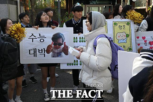 '수능 대박, 넌 할 수 있어!' 후배들 응원 받는 고3 수험생들 [TF사진관]