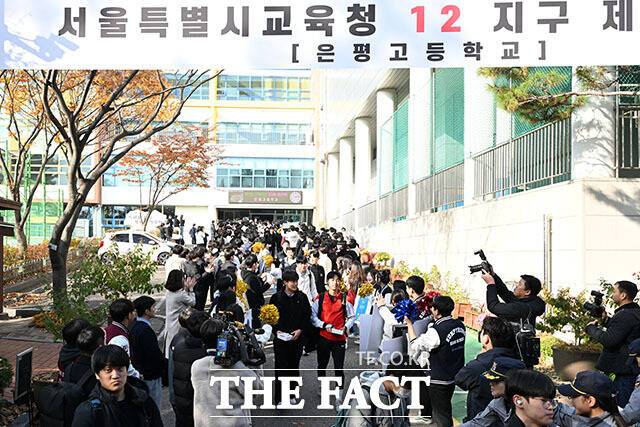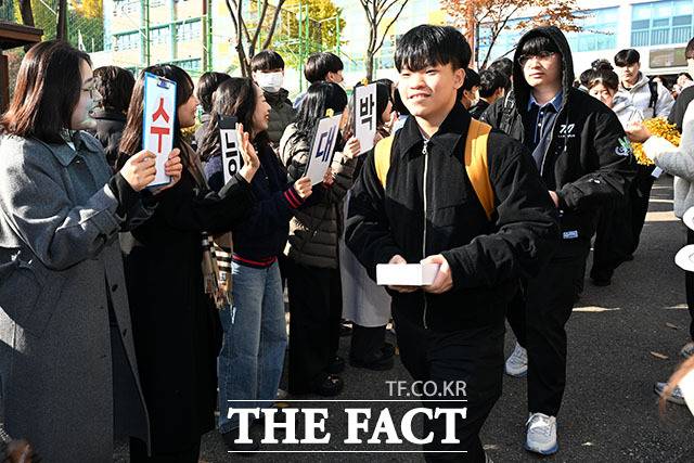 [더팩트ㅣ남용희 기자] 2026학년도 대학수학능력시험(수능)을 하루 앞둔 12일 오전 서울 은평구 은평고등학교에서 1,2학년 학생들이 수험표를 받은 뒤 학교를 나서는 수험생들을 응원하고 있다.