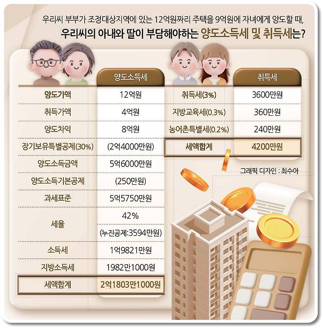 우리씨는 12억원이 아닌 9억원에 딸에게 양도한다고 생각하셨을 테니, 양도소득세 부담이 예상보다 클 겁니다. 우리씨 계산대로 9억원에 양도하는 상황이었다면, 1억2436만6000원이었을 겁니다.