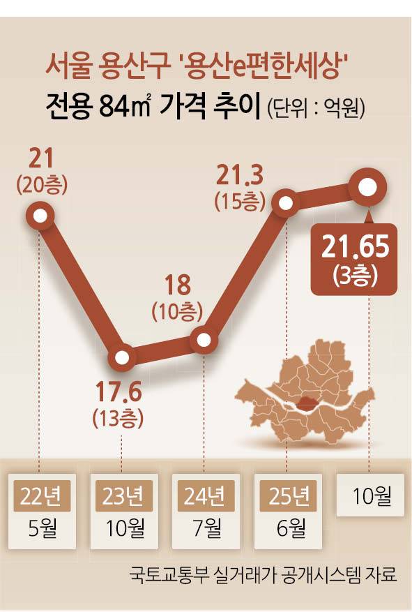 국토교통부 실거래가 공개시스템에 따르면, 삼각지역 인근 ‘용산e편한세상’ 84㎡(전용면적)는 용산 대통령실 이전 계획이 발표됐던 2022년 3월 18억4000만원(3층)에서 불과 두 달 만인 5월 21억원(10층)까지 뛰며 신고가를 기록한 뒤, 지지부진한 흐름을 보였다. 하지만 계엄 선포 이후 지난해 말부터 다시 상승 흐름을 타더니 지난 10월 9일 21억6500만원(3층)에 거래되면서 신고가를 경신했다.