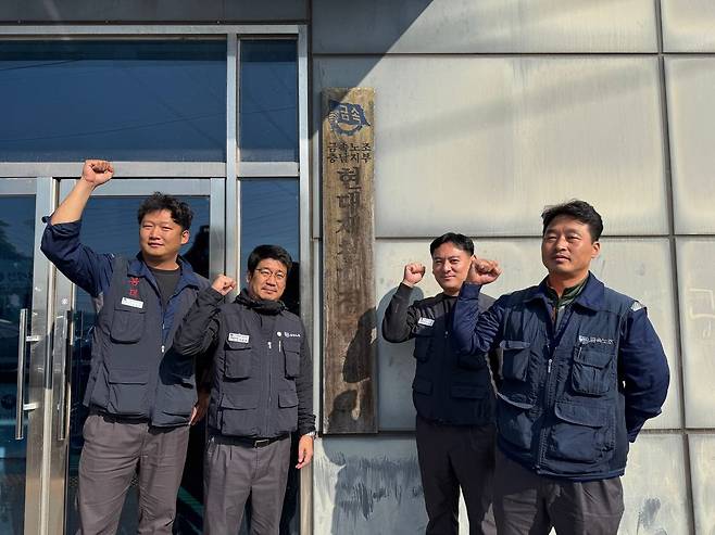 | ▲ 2025.10.29. 노동조합 사무실 앞에 나란히 선 현대제철비정규직지회 집행부 동지들 모습(왼쪽부터 안영근 부지회장, 이상규 지회장, 이유석 노안1부장, 최병률 노안2부장). |