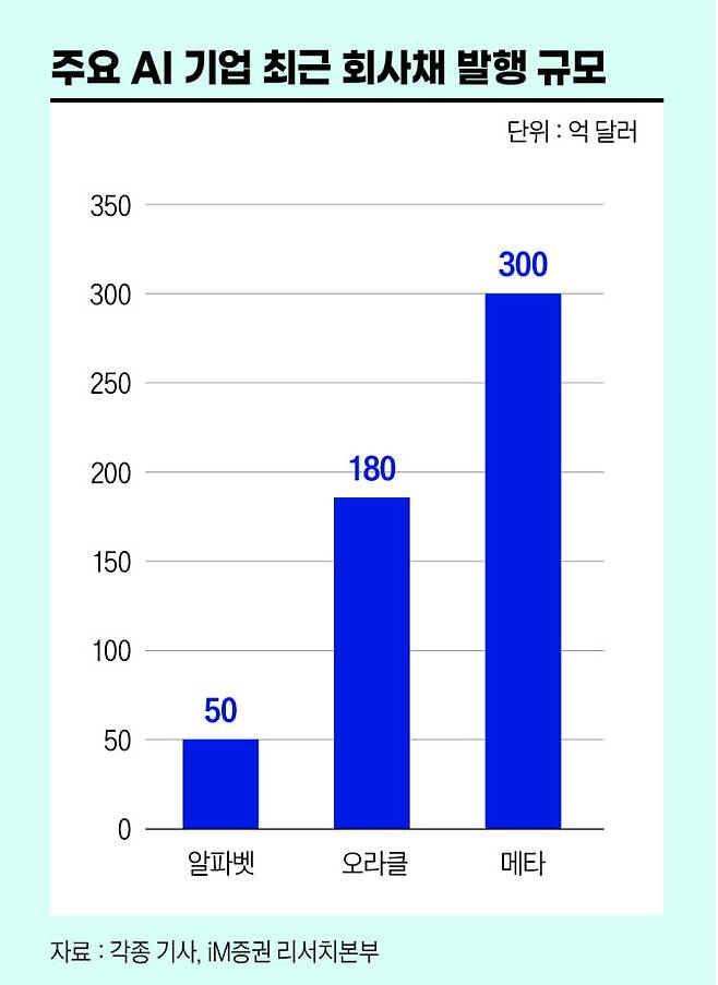 이 문제는 최근 들어 빅테크가 ‘빚투’로 AI에 투자하면서 불을 지폈다. 오라클이 180억 달러에 달하는 회사채를 발행한데 이어 메타, 알파벳 역시 AI 관련 투자를 위해 회사채 발행을 계획했다. 다행히 대규모 회사채 발행에도 불구하고 이들 회사채는 투자자들의 관심 속에 무난히 자금조달에 성공했다. 그러나 경고음도 울린다. 오라클의 CDS 프리미엄 급등과 미국 AAA 회사채 금리의 급등 등이다. 박상현 iM증권 애널리스트는 “AI 사이클이 본격적인 보급률 확산 국면에 접어들고 있고 미·중은 물론 주요국들이 경쟁적으로 AI 투자에 나설 수밖에 없는 환경을 고려하면 AI 투자 과잉을 논할 단계는 아니다”라면서도 “대형 AI 기업들의 대규모 자금조달의 풍선효과와 차입 리스크가 커지고 있음은 앞으로 경계해야 할 부분”이라고 말했다.