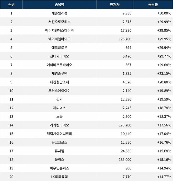 6위 신테카바이오(226330)는 종가 5,470원으로 29.77% 상승 마감했다. 7위 에이비프로바이오(195990)는 종가 367원으로 29.68% 상승 마감했다. 8위 재영솔루텍(049630)은 종가 1,835원으로 23.15% 상승 마감했다. 9위 대진첨단소재(393970)는 종가 4,820원으로 20.80% 상승 마감했다. 10위 포커스에이아이(331380)는 종가 2,140원으로 19.89% 상승 마감했다.