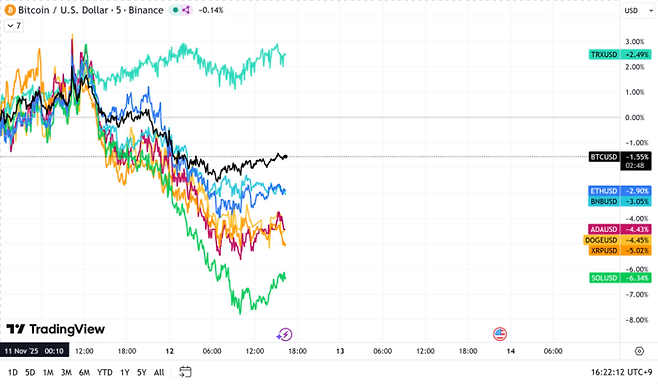 반면 비트코인은 11월 들어서도 5.91% 하락하며 약세를 이어가고 있다. 비트코인은 지난 11월 5일 이후 단기 반등하는 흐름을 가져갔지만 이날 다시 3% 가량 하락하면서 10만 달러선으로 추락했다.
