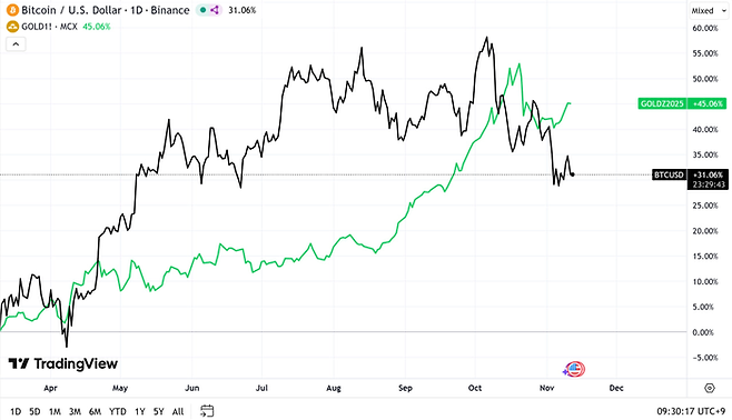 주춤했던 금값이 11월들어 연방준비제도(Fed·연준)의 금리 인하 기대감 등으로 상승세를 보이면서 비트코인은 반대로 약세를 보이고 있다.