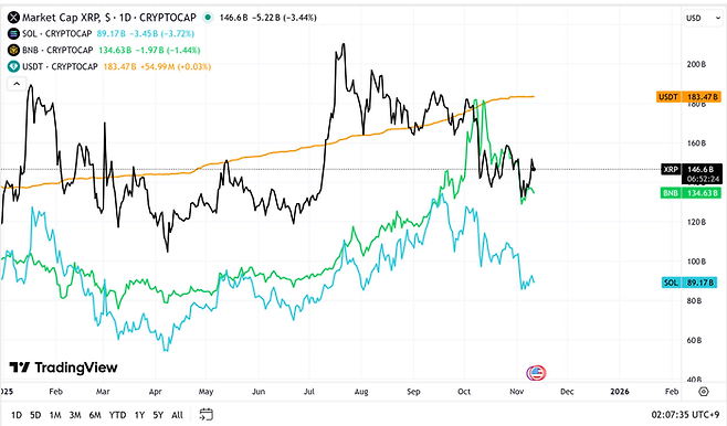 이는 비트코인(2조637억달러), 이더리움(4212억달러), 테더(1835억달러), XRP(1462억달러)에 이어 가상자산시장 시총 5위에 해당하는 규모다.