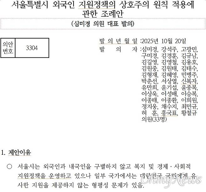 서울시의회는 지난달 23일 국민의힘 소속 시의원 33명이 발의한 '서울특별시 외국인 지원 정책의 상호주의 원칙 적용에 관한 조례안'을 소관 상임위원회에 회부했다.