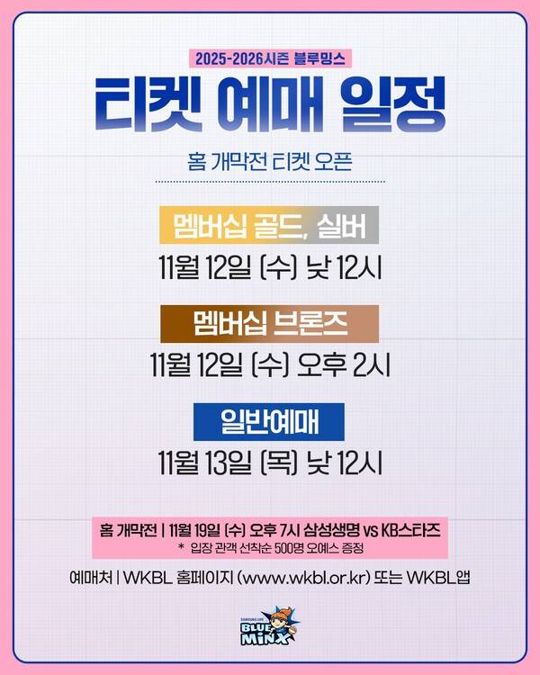 용인 삼성생명 블루밍스가 오는 19일 경기도 용인 실내체육관에서 열리는 2025~2026시즌 WKBL 홈 개막전 입장권 예매를 오는 13일 낮 12시부터 시작한다고 12일 밝혔다.