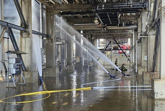 | ▲ 10월 17일 오전 10시 42분께 울산시 남구 용연동 SK에너지 공장에서 폭발사고가 발생하자 울산소방이 출동해 화재를 진압하고 있다. |