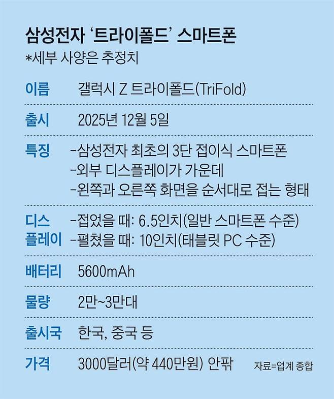 트라이폴드폰의 가격은 3000달러(약 440만원), 초기 출하량은 2만~3만대 수준인 것으로 알려졌다. 판매량을 늘려 수익을 늘리기보다 삼성전자 기술력과 혁신성을 보여주기 위한 ‘초(超)프리미엄’ 전략이다. 출시 국가도 한국을 중심으로 아시아 국가로 한정될 가능성이 크다. 또 통신사를 거치지 않은 자급제 형태로 판매될 것으로 전해졌다. 테크 업계 관계자는 “삼성전자 내부적으로도 판매 목표량을 높게 잡지는 않은 것으로 안다”며 “완성도 높은 트라이폴드 폼팩터(모바일 기기의 형태) 제품으로 기술력을 선보이고 시장 반응을 확인하기 위한 목적이 크다고 본다”고 했다. 삼성전자는 지난달 경주에서 열린 아시아태평양경제협력체(APEC) 무대에서도 트라이폴드폰 실물을 전시했다.