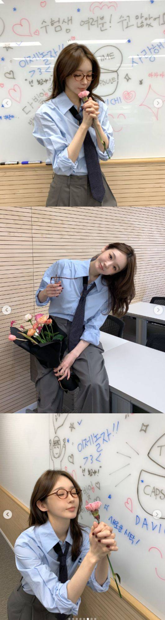또 칠판에는 ‘수험생 여러분! 수고 많았어요’, ‘이제 놀자’, ‘사랑해’, ‘새로운 시작’ 등 다양한 글들이 작성되어 있었다. 이를 배경으로 강민경은 양손 깍지를 끼고 기도하거나 한쪽 무릎을 꿇고 꽃다발을 내밀며 수능 시험을 앞둔 수험생들을 응원했다.