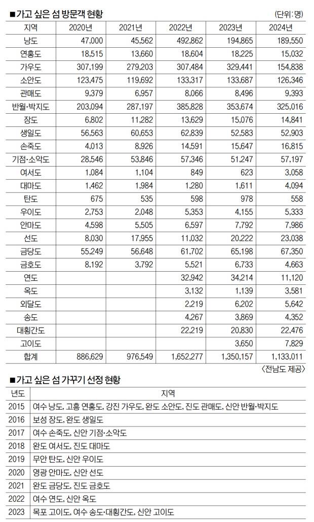 한 해 50만명에 육박했던 여수 낭도 방문객 수는 지난해 18만 9550명으로 반토막이 났고 30만명이 꾸준히 찾았던 강진 가우도도 지난해 15만 4838명으로 절반 가까이 줄었다. 게스트하우스, 탐방로정비·마을카페, 마을식당 등의 시설 인프라 개선만으로는 관광객을 꾸준히 불러모을 수 없다는 것을 보여주는 수치다.