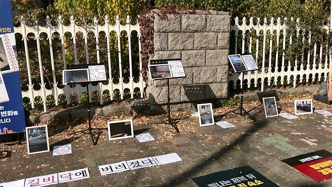 전국경찰직장협의회는 오늘 서울 여의도 국회 앞에서 APEC 파견 경찰관의 열악한 근무 여건을 고발하는 사진전을 열었습니다. 어제 경찰청 앞에 이어, 국회로 장소를 옮겼습니다. 사진 사이에 놓인 작은 손팻말에는 "경찰을 노숙인으로 만든 경주 APEC"이란 글이 적혀 있었습니다.